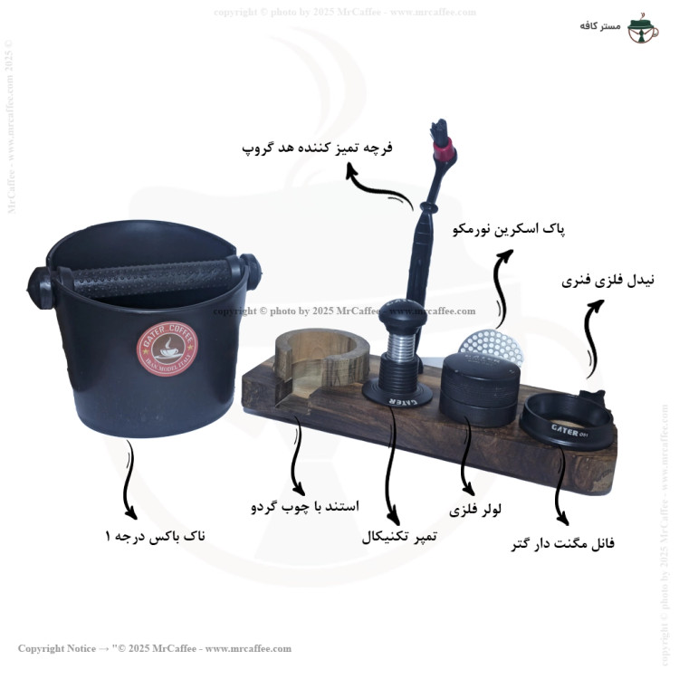 پایه نگهدارنده استنددار، نظم محیط کار را حفظ کرده و دسترسی سریع به ابزارها را فراهم میسازد. این ست انتخابی مناسب برای استفاده در کافهها و برای افرادی است که به دقت و جزئیات در تهیه اسپرسو اهمیت میدهند.
